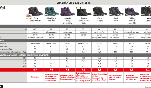 Fazit: Die Stiefel von Ecco erhalten die höchste Gesamtbewertung. Sie halten lange trocken, atmen gut, isolieren effektiv und trocknen relativ schnell. Am unteren Ende finden sich Modelle wie Linear, Lejon und Leaf – sie lassen schnell Wasser eindringen und leiten kaum Feuchtigkeit ab, wodurch sie bei Schnee und Matsch rasch durchnässen.