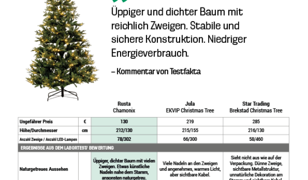 Test und Bewertung von Qualität und Haltbarkeit: Die Haltbarkeit der Befestigung der Nadeln wurde getestet, indem fünf Personen die Nadeln an einem 20 cm langen Ast dreimal hin und her rieben. Die Haltbarkeit der Konstruktion wurde getestet, indem der Baum fünfmal von fünf verschiedenen Testpersonen montiert, demontiert und wieder verpackt wurde.