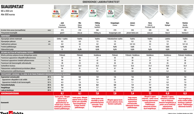 Testfakta on teettänyt testejä yhdessä saksalaisen Ergonomie Institut Münchenin ja ruotsalaisen RISE:n kanssa selvittääkseen, mitkä sijauspatjat tarjoavat parhaan tuen. Testatut mallit ovat 6,5–9 cm paksuisia, niiden ydin on vaahto- tai lateksimateriaalia ja ne maksavat alle 300 euroa.