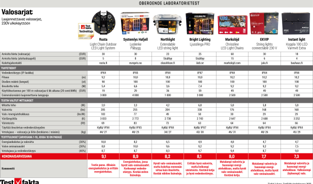 Yhteenvetona Rusta nousi testivoittajaksi tasaisen hyvillä tuloksilla kaikilla kolmella osa-alueella ja korkeimmalla kokonaisarvosanalla 9,1 – tiukasti perässä norjalainen Systemlys (8,9). Heikoimmin suoriutui Bauhausin Instant Light (7,3).
