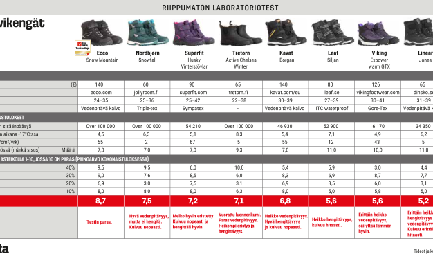 Testfakta antoi riippumattoman saksalaisen laboratorion PFI tehtäväksi vertailla yhdeksää paria lasten ja nuorten talvikenkiä, joita myydään Ruotsissa koossa 30–40. Tulokset osoittavat suuria eroja vedenpitävyydessä, lämmöneristyksessä, hengittävyydessä ja kuivumisajassa.