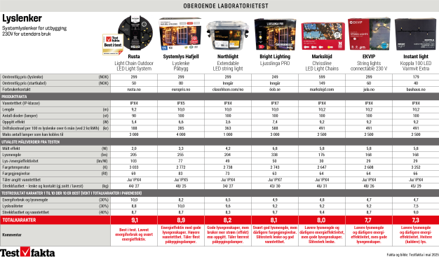 Samlet sett blir dermed Rusta testvinner, med gode resultater på alle tre testområder og høyest totalpoengsum på 9,1 – tett fulgt av norske Systemlys med 8,9. Dårligst presterte Instant Light fra Bauhaus med 7,3.
