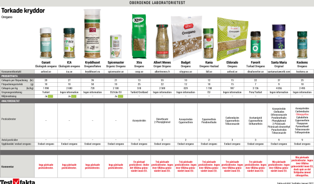 Studier i Tyskland och Storbritannien har visat på utbrett fusk där torkad oregano drygats ut med bland annat olivblad. Testfaktas analys av tolv vanliga fabrikat visar att det som säljs i svenska butiker håller en hög nivå på den punkten – samtliga fabrikat innehöll endast oregano. Men analysresultatet av bekämpningsmedel var inte lika positivt.