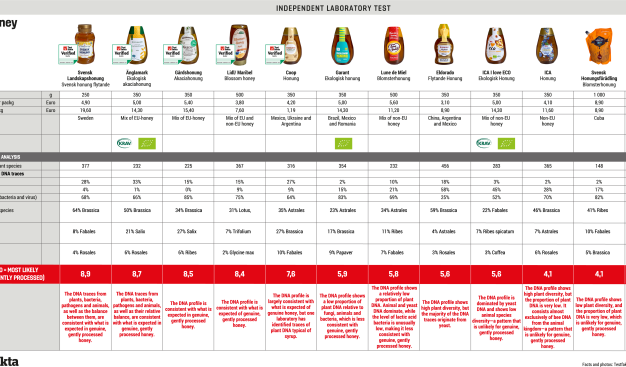 To investigate how widespread this issue is in Sweden, Testfakta commissioned two independent laboratories—Celvia in Estonia and Sinsoma in Austria—to analyze twelve liquid honeys using new, advanced DNA technology.