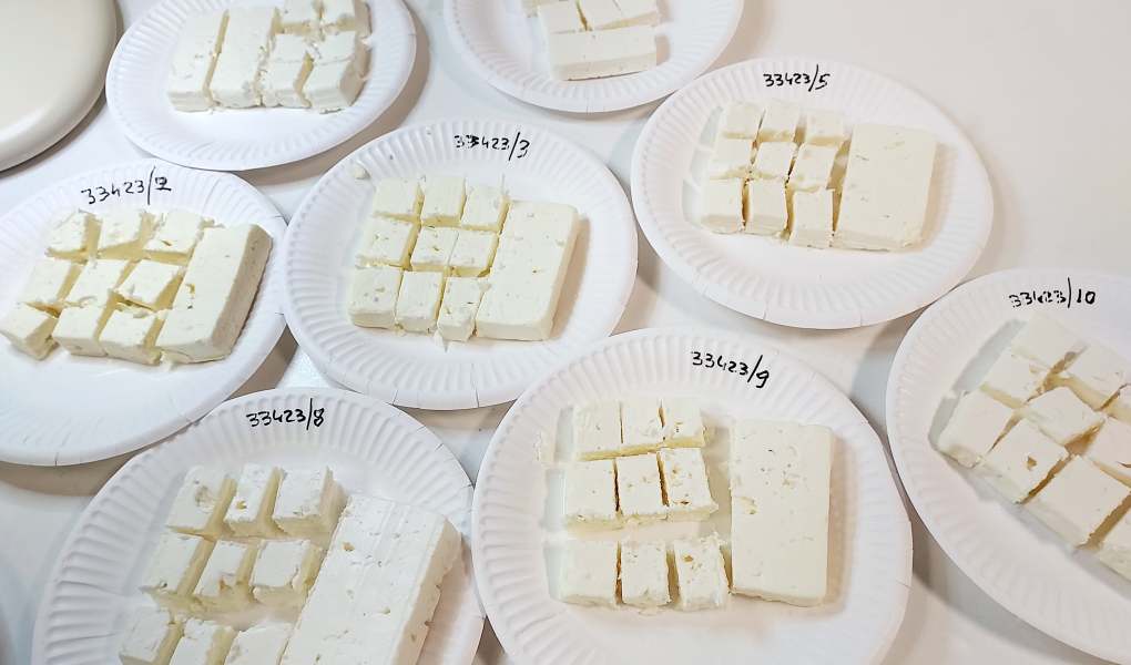 In the sensory analysis, five specialists from the laboratory taste the different feta cheeses. The cheeses are rated on a scale from 1 to 5 based on the above criteria for taste, aroma, appearance and texture, where a rating of 5 means that the cheese is of good quality.