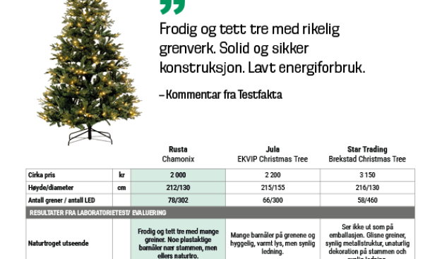Testfakta Research har på oppdrag fra Rusta gjennomført en laboratorietest av kunstige juletre. Formålet med testen er å evaluere kvalitet og ytelse for Rustas juletre Chamonix til en pris på 2 000 kr. For å få et relativt inntrykk av modellens kvalitet og ytelse har den blitt testet og evaluert sammen med følgende to sammenlignbare produkter på markedet: