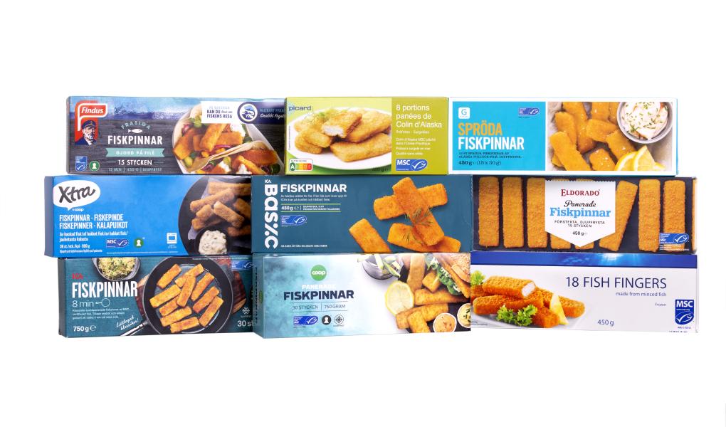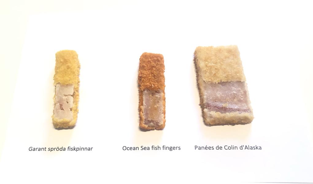 Huvudingrediensen i fiskpinnar är vit fisk. Sju av förpackningarna anger att innehållet är Alaska Pollock och två, Coop och Xtra, deklarerar torsk. I det senare fallet visar dock laboratoriets analys att det är en blandning av torsk och kolja och därmed stämmer inte innehållsförteckningen även om kolja tillhör familjen torskfiskar.