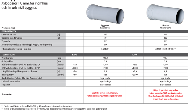 För att få en uppfattning om avloppsrörets relativa kvalitet och prestanda har det testats tillsammans med ett jämförbart avloppsrör från Uponor.